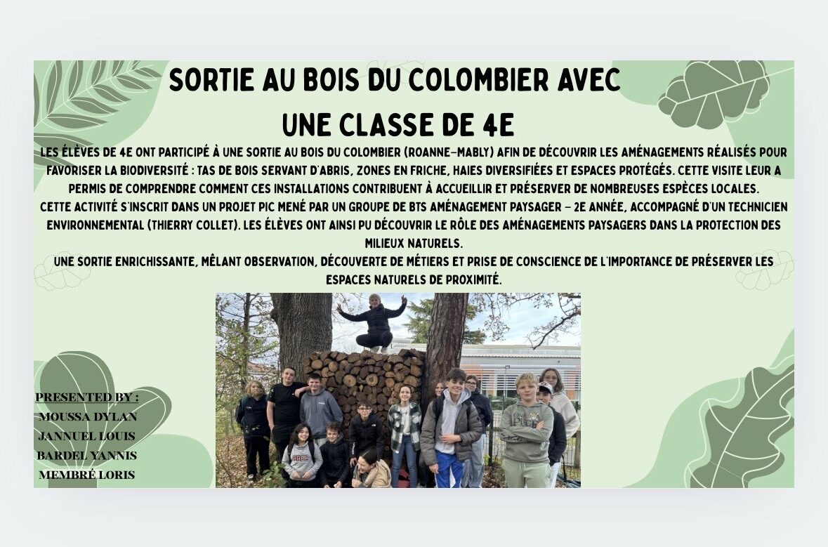 Les élèves de 4ème ont participé à une sortie au bois du colombier afin de découvrir les aménagements réalisés pour favoriser la biodiversité : tas de bois servant d’abris, zones en friche… Cette visite leur a permis de comprendre comment ces installations contribuent à accueillir et préserver de nombreuses espèces locales.